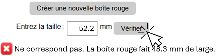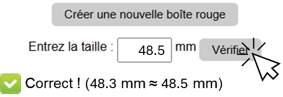 Créez une boîte rouge en cliquant sur le bouton situé sous la règle. Ensuite, faites-la glisser en maintenant le bouton gauche de la souris enfoncé jusqu'à aligner le zéro avec le bord gauche de la boîte. Lisez la valeur au niveau du bord droit, saisissez-la dans le champ ci-dessous, puis cliquez sur le bouton pour vérifier si la mesure est correcte.Considérez le panneau du simulateur :