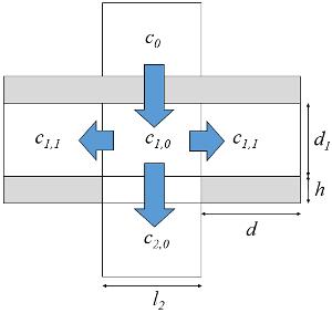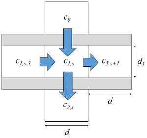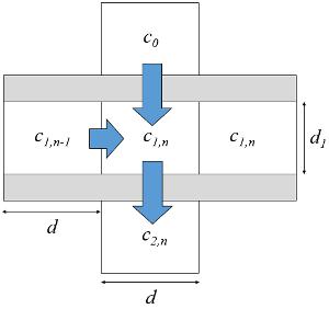 | $\displaystyle\frac{\partial c_{1,0}}{\partial t}=\displaystyle\frac{D_{s0}}{2\pi Rd_1}(c_0-c_{1,0})+\displaystyle\frac{2D}{l_2}\displaystyle\frac{\partial c_{1,s}}{\partial s}-\displaystyle\frac{D}{hd_1}(c_{1,0}-c_{2,0})$ |