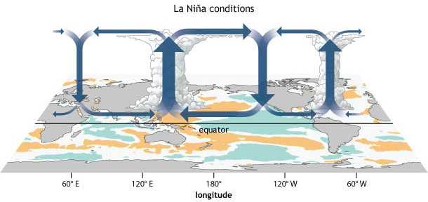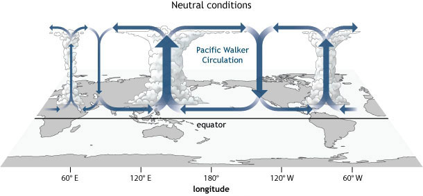Bajo condiciones normales se observan dos zonas de convección importantes, una sobre el caribe (longitud 80W) y la otra sobre Oceanía (longitud 150E). En altura ambas contribuyen aire a la zona en que descienden las masas aéreas sobre el pacifico occidental (longitud 150W).