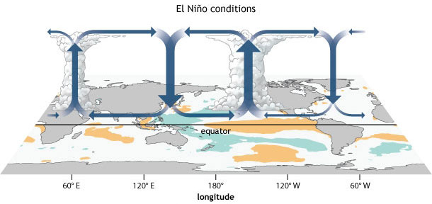 Bajo la condición del niño la circulación se invierte transformándose zonas de deceso de masas de aire en zonas de convección y a la inversa. Solo la zona de convección sobre África permanece y se incrementa mientras que la zona de deceso sobre el mal indico desaparece:
