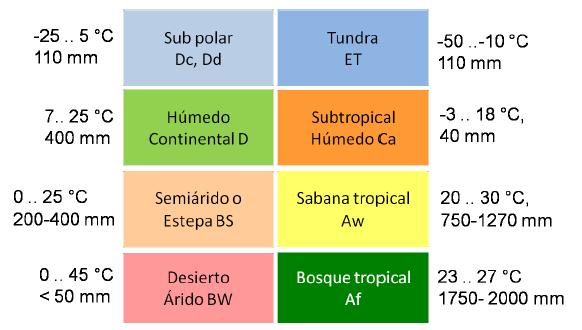 Las celdas de Hardley, Ferrel y polar generan franjas que condicionadas por las corrientes aéreas de superficies llevan a situaciones distintas en lo que se refiere a las temperaturas:- celda de Hardley, temperaturas mas altas- celda de Ferrel, temperaturas medias- celda polar, temperaturas bajasAdicionalmente se generan corrientes marinas que circulan de modo de fluir:- de la región polar en dirección del ecuador llevando agua fría y- de la región ecuatorial a la polar llevando agua calientepresentándose la primera en el lado oeste y la segunda en el lado este de los continentes. Esto significa que existe un total de seis típicas zonas climáticas.