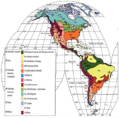 En el caso de américa la cordillera separa climáticamente los lados oeste y este del continente. Adicionalmente se reconocen las zonas asociadas a las celdas de Hardley, Ferrel y polar lo que se puede ver mejor en Norteamérica: