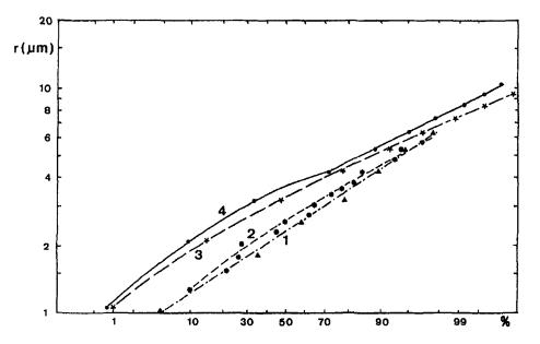 Según la gráfica el 50% de las gotas tienen un radio inferior a unos 2.2 mu. Por ello podemos concluir que> La típica gota de neblina tiene un radio de 2.2 mu