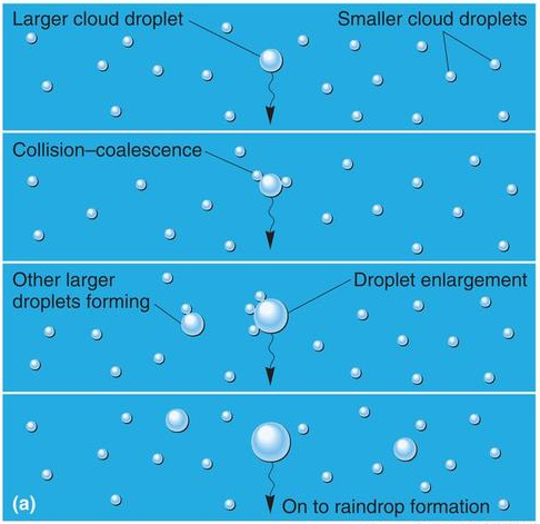 El proceso de crecimiento continua tanto por adhesión de nuevas moléculas a gotas ya existentes o por fusión de micro gotas que colisionan y forman gotas mas grandes.