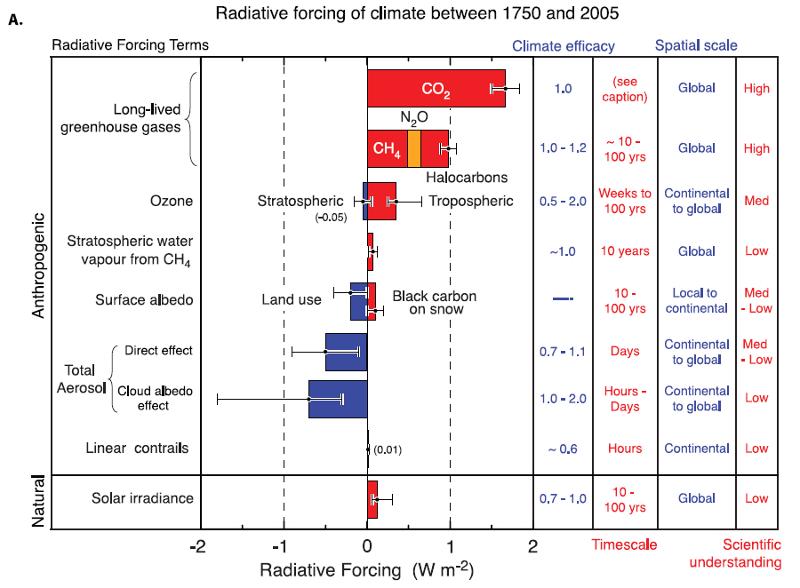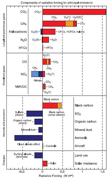 En el diagrama se muestra el forzamiento radiativo de los principales gases en la atmósfera: