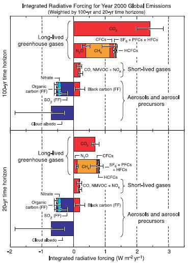 La gráfica muestra las proyecciones de los cambios radiativos esperados en el horizonte de 20 y 100 años: