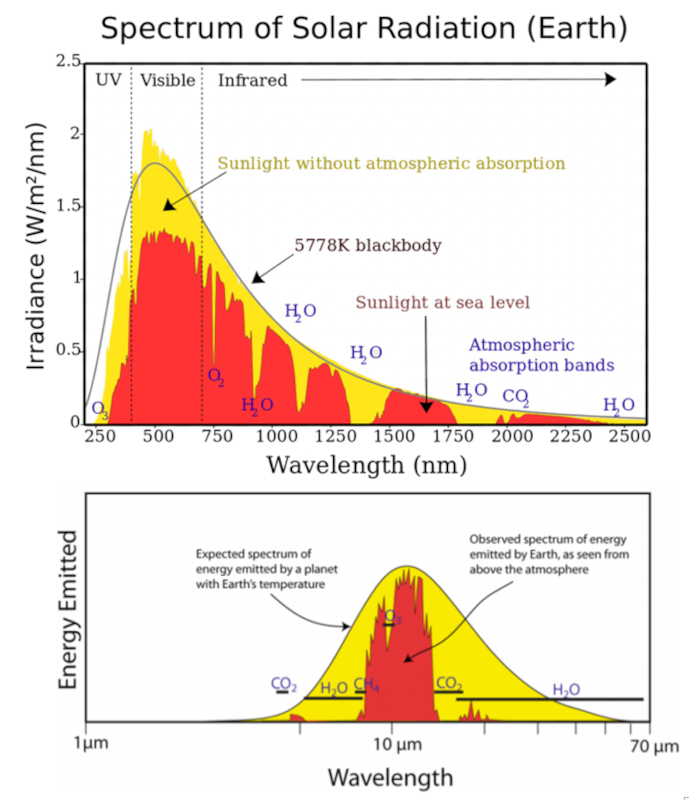 Esto se puede visualizar gráficamente mediante los espectros. La línea amarilla representa el espectro tal como se emite: en la parte superior, por el sol (visible) y por la tierra (infrarrojo). En rojo se muestra el espectro restante después de haber atravesado la atmósfera, destacándose claramente las frecuencias que no logran pasar debido a la absorción: