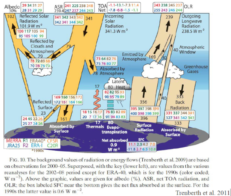 En un estado de equilibrio la energía capturada del sol tiene que necesariamente ser igual a aquella que la propia tierra emite devuelta al espacio. La primera llega principalmente como radiación visible, calienta el planeta y este a su vez re emite como radiación infrarroja via la atmósfera devuelta al espacio.