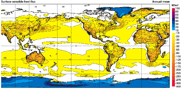 Se observarmos a distribui o do calor transportado por convec o sobre a superf cie do planeta, podemos notar que existem n veis mais ou menos constantes. Por um lado, temos as zonas oce nicas e continentais com um fluxo em torno de $17 W/m^2$ (ascendente) e aproximadamente $-30 W/m^2$ (descendente) em reas cobertas de neve e gelo: