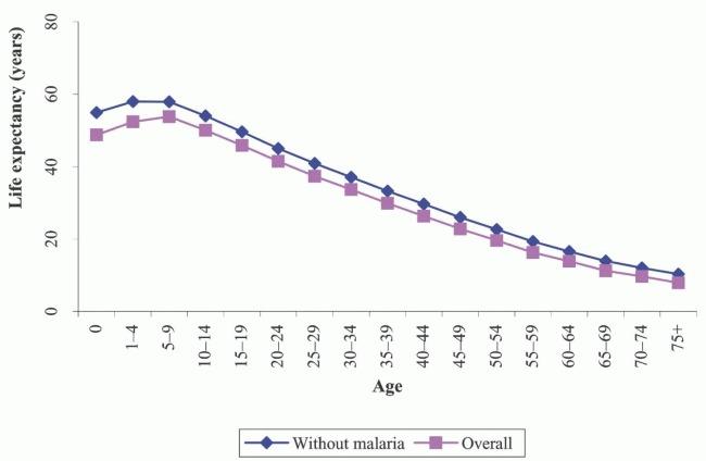 La expectativa de vida promedio de una persona con malaria se reduce en promedio en aproximadamente 10 años. La gráfica adjunta, del estudio ['How Many Years of Life Could Be Saved If Malaria Were Eliminated from a Hyperendemic Area of Northern Ghana?'](http://www.gphysics.net/downloads/medicine/Bookshelf_NBK1712.pdf) de Ayaga A. Bawah and Fred N. Binka muestra la expectativa de vida según edad con y sin malaria: