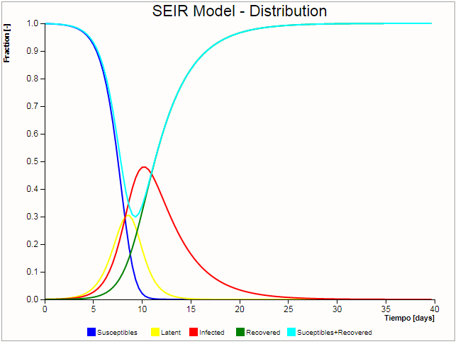 En el caso de los modelos SEIR se tienen cuatro curvas, la de susceptibles, latentes, infectados y recuperados:
