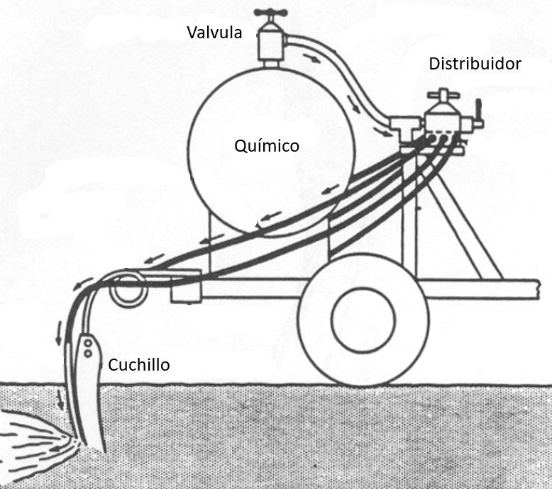 En caso de que se busca introducir el qu mico como liquido en el suelo se trabaja con un sistema que lleva un estanque y trabaja con un cuchillo de abre la tierra para depositar el liquido:
