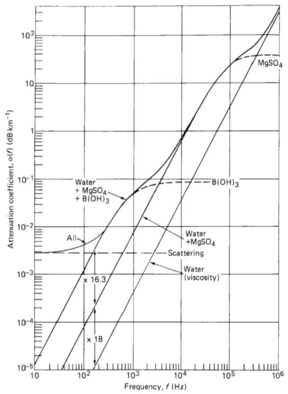 Die Dämpfung von Schallwellen im Ozean hängt von der Frequenz des Schalls ab. Für niedrige Frequenzen (unter 10 kHz) stammt der Hauptbeitrag von Borsäureionen, während im Bereich zwischen 10 kHz und 100 kHz der Effekt von Magnesiumsulfationen eine Rolle spielt. Für höhere Frequenzen ist die Dämpfung hauptsächlich auf die Viskosität des Wassers zurückzuführen.