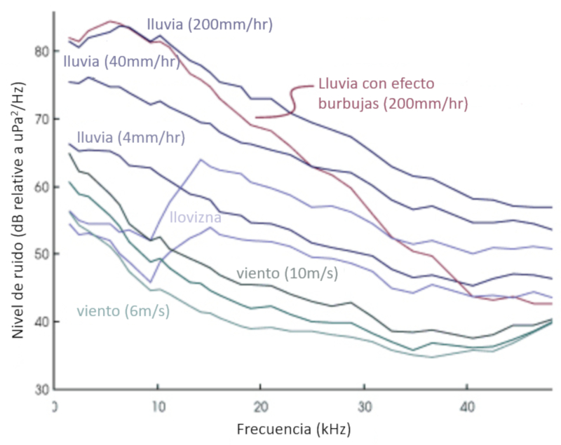 Die Spektren der Quellen, die der Messung der Schallamplituden nach ihrer Frequenz entsprechen, zeigen das starke Vorhandensein der Regenf lle: