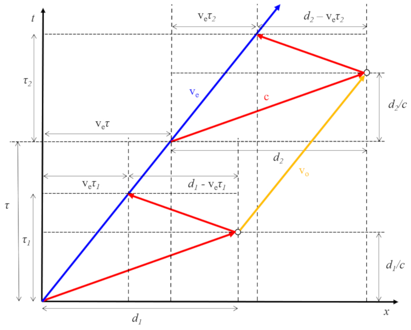 $d_2-d_1=\displaystyle\frac{1}{2}( c + v_e )( \tau_2 - \tau_1 )$