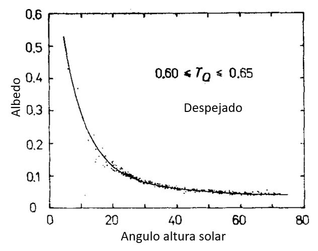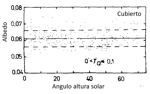 Cuando el cielo esta cubierto la mayor parte de la luz es difusa por lo que la influencia de la luz directa del sol decrece y se observa el valor del albedo de ngulos mayores de incidencia para cielo descubierto: