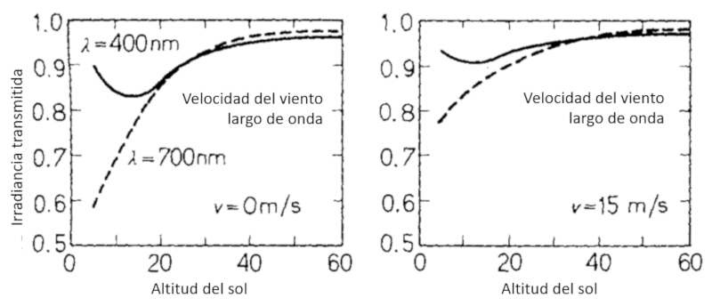 Al igual que la incidencia del sol afecta la reflexión (albedo) lo hace con el complemento que es la transmisión. Esto se observa experimentalmente: