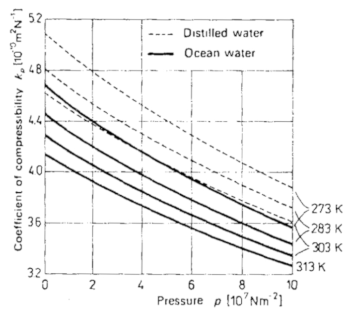 El coeficiente de compresibilidad para el agua oceánica, medido en función de la temperatura, sigue la forma indicada en el siguiente gráfico: