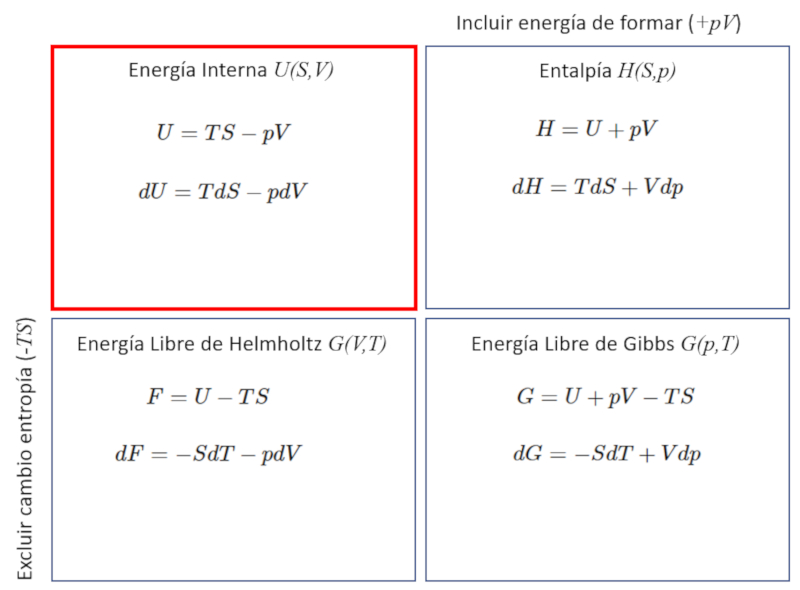 The thermodynamic potentials correspond to different variations of the internal energy $U$, which can include the energy required to form the system equivalent to the work $pV$, as well as the energy that cannot be used to perform work, which is $TS$.