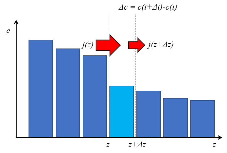 | $ \displaystyle\frac{\Delta c }{\Delta t } = -\displaystyle\frac{\Delta j }{\Delta z }$ |