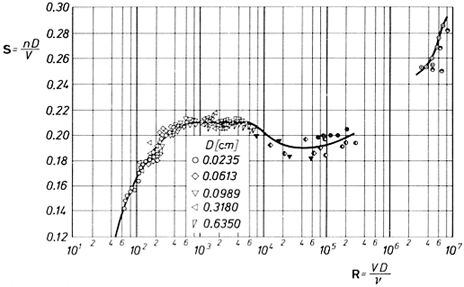 Le numéro de Strouhal ($St$) est reli empiriquement le le numéro de Reynold ($Re$). Le numéro de Strouhal ($St$) est associ a fréquence de génération de vortex ($\omega$), a vitesse de friction ($U_d$), et a profondeur totale ($H$) est