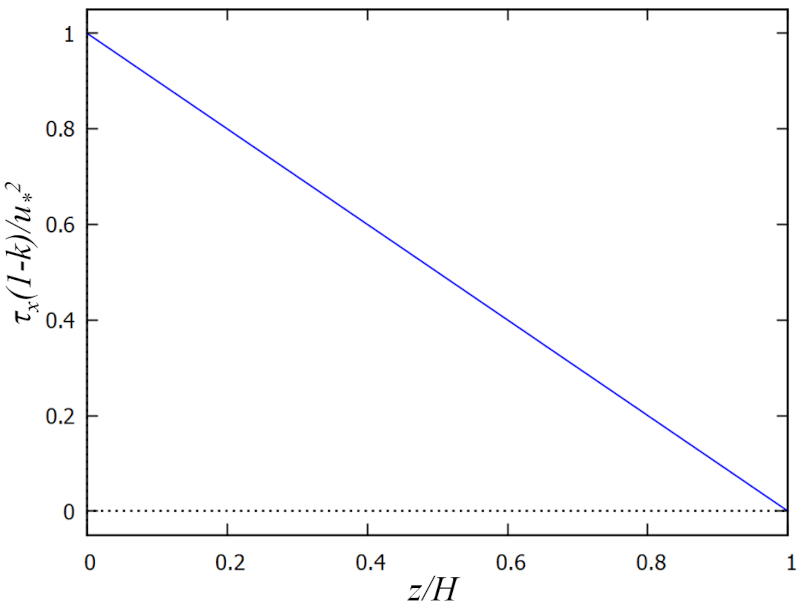 Si l'on suppose qu'il n'y a pas de vent la surface, on peut supposer qu'il n'y a pas de tension cet endroit. Par cons quent, il n'y aura de tension de l'eau que sur le fond. Cette tension diminuera lin airement du fond vers la surface. Pour simplifier la mod lisation, on peut utiliser la proportion entre a profondeur ($z$) et a profondeur totale ($H$), ce qui nous donne un facteur adimensionnel a profondeur relative ($\xi$). A contrainte cinématique ($\tau_x$) sera donc proportionnelle