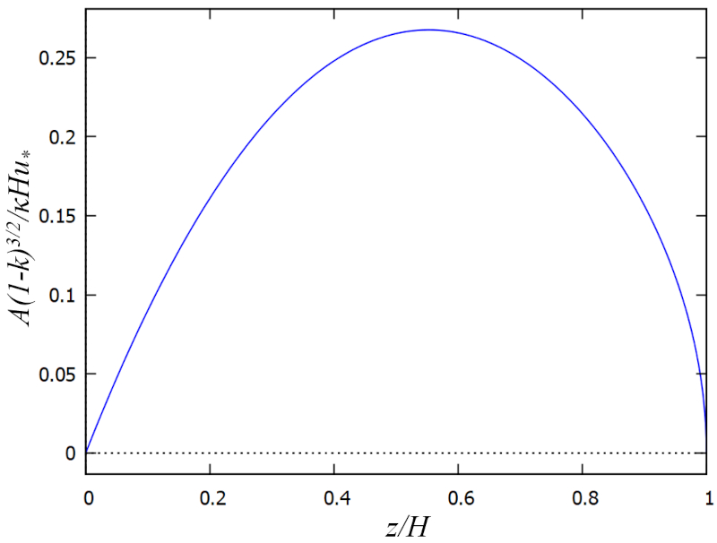 Avec la formulation de a viscosité turbulente ($A$) en termes de a profondeur relative ($\xi$) ainsi que a profondeur totale ($H$), a rugosité ($k$) et a vitesse de friction ($U_d$), et en consid rant que