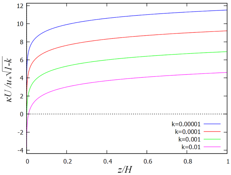 $u_z=\displaystyle\frac{U_d\sqrt{1-k}}{\kappa}(\ln(z/d) + \Phi(\xi,k))$