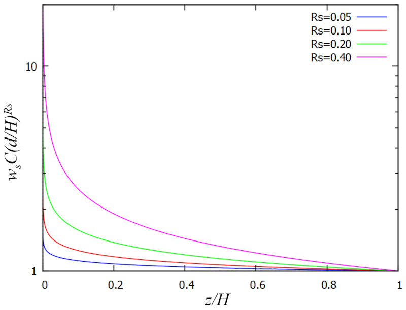 ERROR:9478 est une fonction de a profondeur relative ($\xi$) qui d pend de le taux d'érosion ($E$), a taux de sédimentation ($\omega_s$), a rugosité ($k$) et le facteur de Rouse ($R_s$), et se calcule de la mani re suivante :