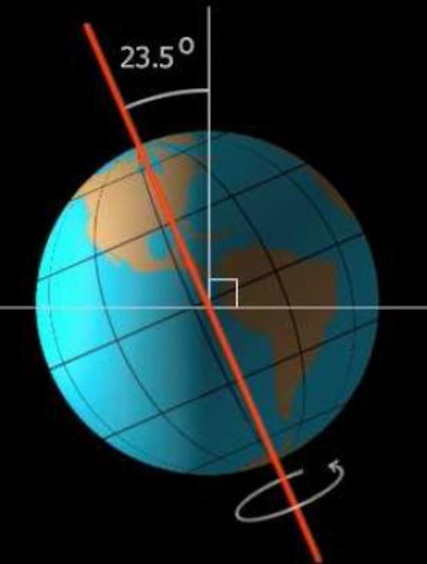 The axis of the Earth has an inclination of 23.5 degrees with respect to the ecliptic.