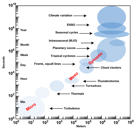 - Les phénomènes associés à la circulation se caractérisent par des échelles de longueur et de temps autour d\'une vitesse de 1 m/s. Cela inclut des phénomènes tels que la turbulence (de quelques mètres à quelques kilomètres et des périodes de quelques secondes à quelques heures) ainsi que les phénomènes météorologiques (des centaines de kilomètres et des durées de quelques jours à un mois).