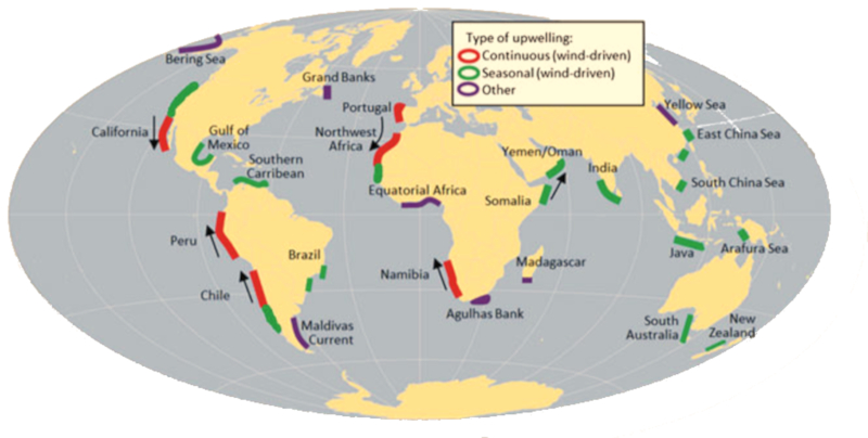 Existen distintas zonas en el mundo en donde por vientos, ya sea en forma permanente o estacional, existe surgencia. Esto lleva a que en estos lugares las corrientes que van en dirección de la costa arrastran aguas frias ricas en vida en dirección de la superficie con lo que se favorece la vida en la superficie.