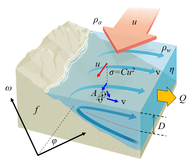 Con la velocidad de Ekman ($u_e$) y la profundidad de Ekman ($D_E$), se puede estimar el volumen transportado, o el transporte de Ekman ($Q$):