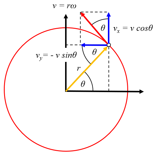 $v=\displaystyle\frac{\Delta s}{\Delta t}=r\displaystyle\frac{\Delta\theta}{\Delta t}=r\omega$