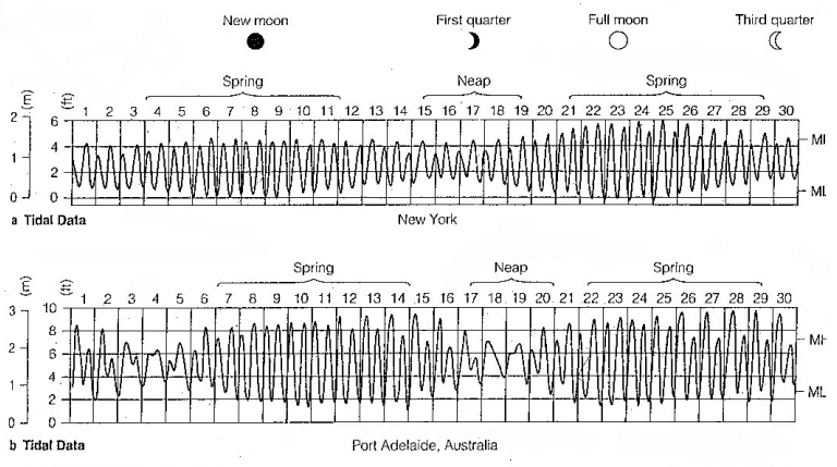 The overlap of lunar and solar tides leads to either more extreme tides or compensatory effects that reduce them. Additionally, there is discussion about the effect of water being unable to move freely due to the presence of continents.