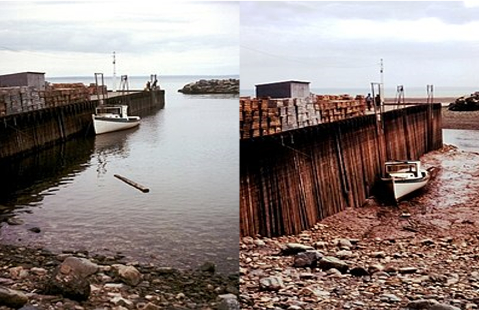 An extreme example is illustrated in the following image of Alma, New Brunswick, Canada, in the Bay of Fundy. This tide surpasses by far the maximum value that occurs when the sun and moon align (24.42 cm + 53.5 cm = 77.92 cm). The reason for this is the displacement of water, which is halted by the American continent, leading to this accumulation.