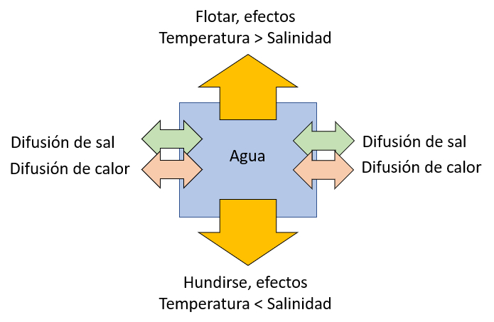 In this sense, there is a competition between the effects of temperature and salinity, where the volume can try to rise or sink. The latter case is key for the generation of deep currents.