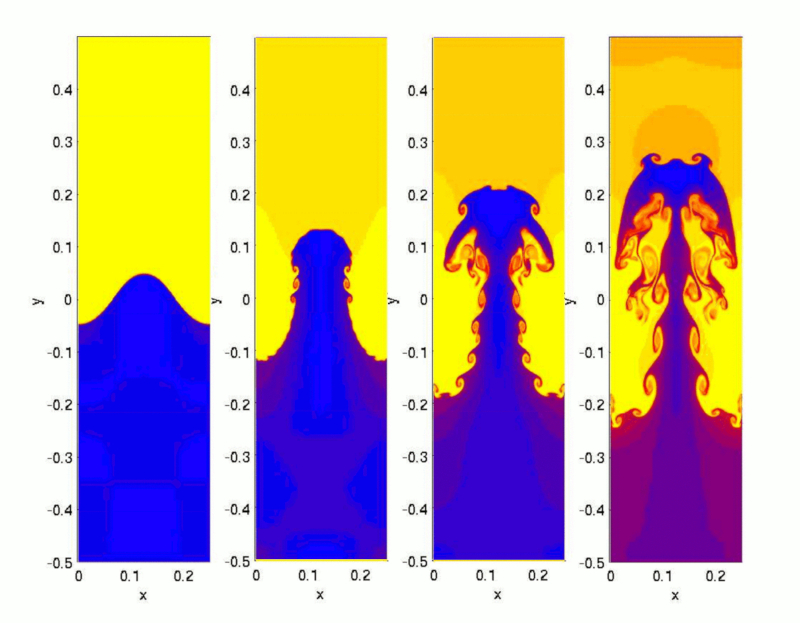 In this case, there are regions where water with higher salinity sinks while water with lower concentration rises. These sinking salt zones are called salt fingers and can be seen in the following graph generated through simulation: