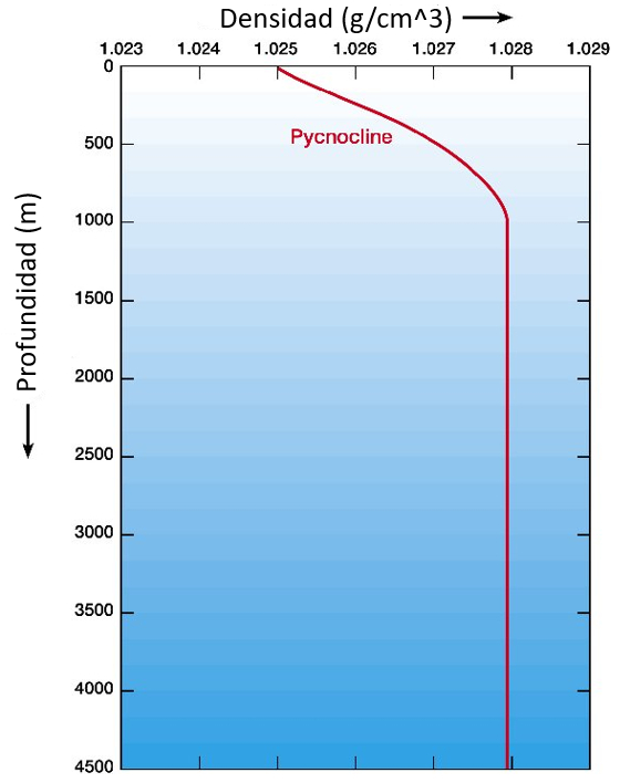 The stability of the marine water column depends on both temperature and salinity. If the temperature increases, the water expands, creating a zone of lower density, causing the volume to tend to float. Conversely, if salinity increases, density increases, causing the volume to sink. In this sense, there is a competition between the effects of temperature and salinity, where the volume can try to rise or sink. The latter case is key for the generation of deep currents.