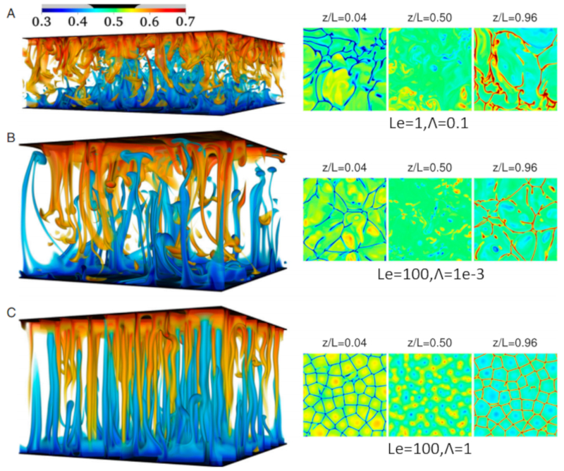 Once the temperature difference between the surface and the bottom exceeds a critical value, true jets of hotter water start to emerge, reaching the surface and creating space for the cooler surface water to descend towards the bottom: