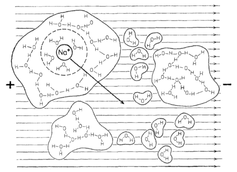 Wenn ein elektrisches Feld an Wasser mit Salzionen angelegt wird, beginnen sich diese in Richtung der positiven Pole zu bewegen: