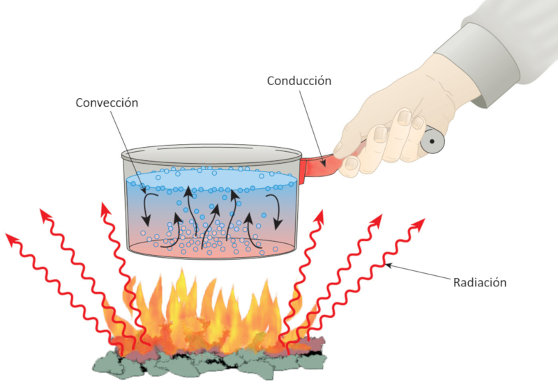 Heat is associated with elements like fire, which causes the temperature of water to rise. The process of heating generates movement, indicating that heat is related to mechanical energy. Even the handle of a pot gets heated, and our bodies are capable of perceiving that temperature. Moreover, fire emits radiation that heats up objects that are exposed to it.