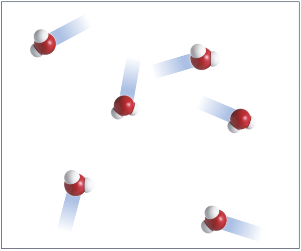 The gaseous phase of water corresponds to what is known as water vapor. It is created as water molecules acquire enough kinetic energy to escape from the liquid phase and begin to move through the space above the liquid. Periodically, the molecules in the gaseous state collide with the liquid surface again and are captured, returning to the liquid state.
