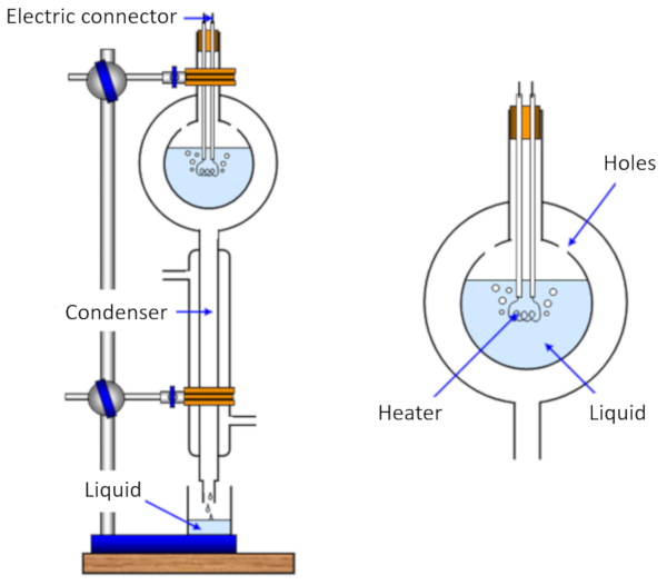 The measurement of the heat of vaporization is carried out by heating a sample, causing it to evaporate, while simultaneously measuring the heat delivered to the sample. Then, the vapor is cooled and condensed back, and the mass that originally evaporated is measured.