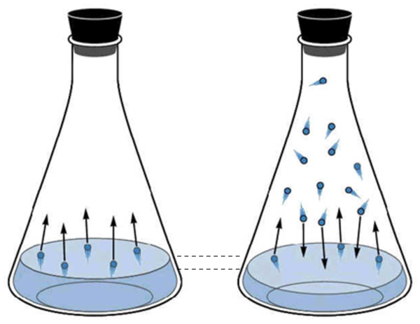 As the number of molecules in the gaseous state increases, so does the number that returns to the liquid. This process continues until an equilibrium is reached between the molecules leaving the liquid and those being reabsorbed. In this situation, it is said that the space above the liquid is saturated.