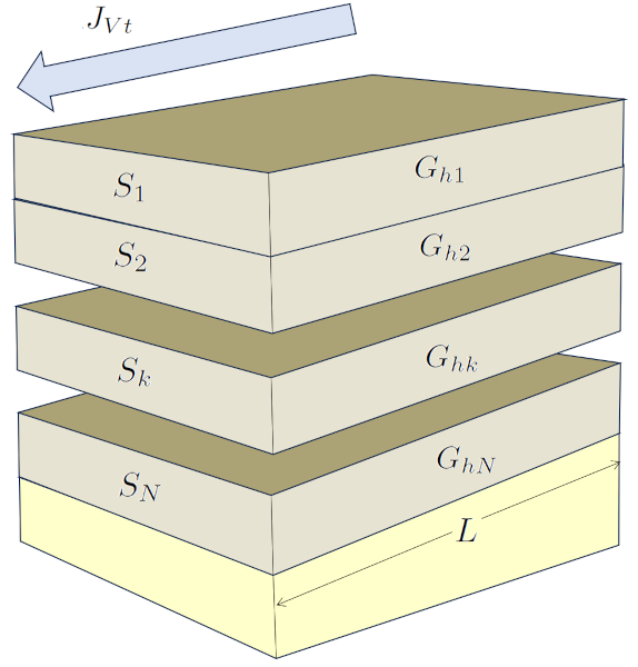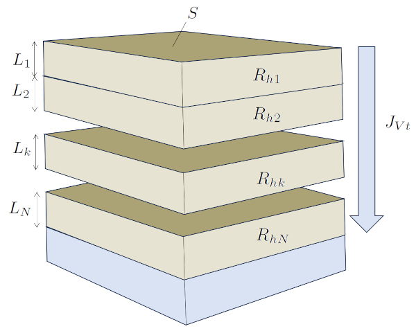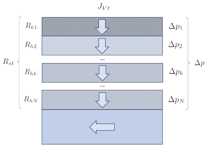 In this scenario, hydraulic resistances are directly summed, and their values depend on the type of soil, and therefore, on the hydraulic conductivity in the kth layer ($K_{sk}$) and the width of the kth layer ($L_k$).