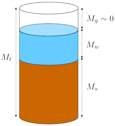 • la massa de gás no solo ($M_g$): Compreende a massa do gás ou ar contido na amostra (que pode ser considerada comparativamente como sendo quase zero, ou seja, $M_g\sim 0$).
