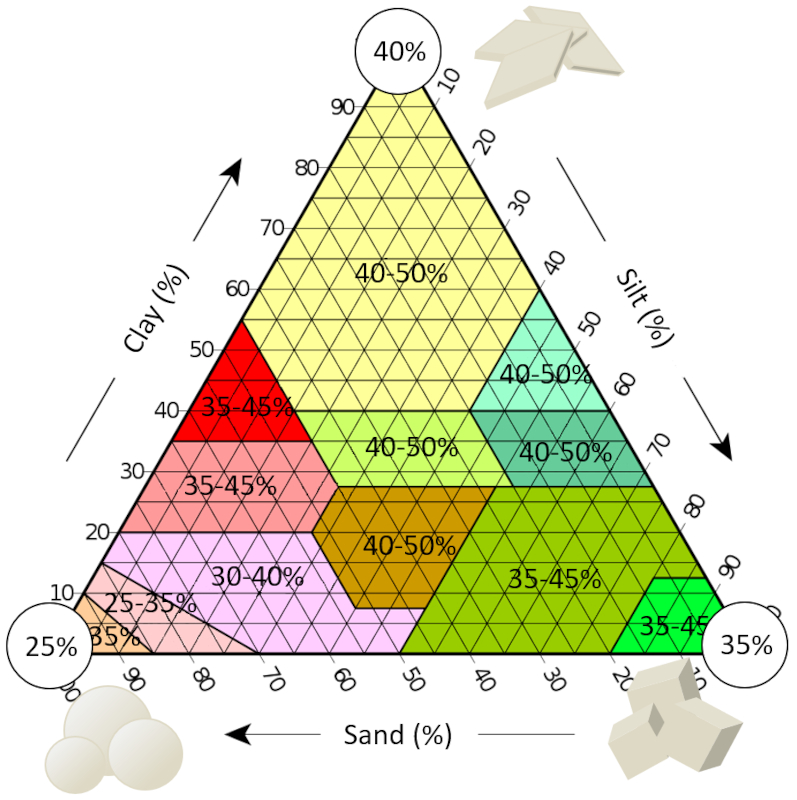 In the case of soils in general, we can study the soil texture triangle. If we describe the typical range of porosity observed for each type of soil, we can see what was discussed earlier. In the corner where sand prevails, we have a porosity that can reach up to 25%, which is optimal for a model of spheres:
