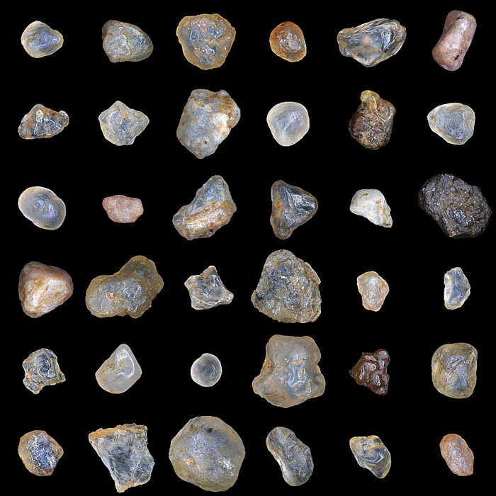 Sand grains of yellow building sand. Microscope Lumam R-8. EPI lighting. The photo of each grain of sand is the result of multifocal stacking by Alexander Klepnev (commons.wikimedia.org).