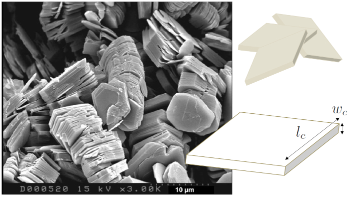 If we model a clay grain as a right parallelepiped and assume it has dimensions of the length and width of a clay plate ($l_c$) and the height of a clay plate ($w_c$), we can calculate the volume of a grain of clay ($v_c$) using the following equation: